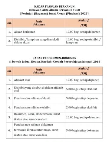 - for swearing of oaths, affidavits (for court action, matter or proceeding) and other legal documents e.g., as required by Jabatan Pendaftaran Negara (JPN), Jabatan Pengangkutan Jalan (JPJ), Immigration Department (Jabatan Imigresen Malaysia), etc., and affirmation of statutory declarations.